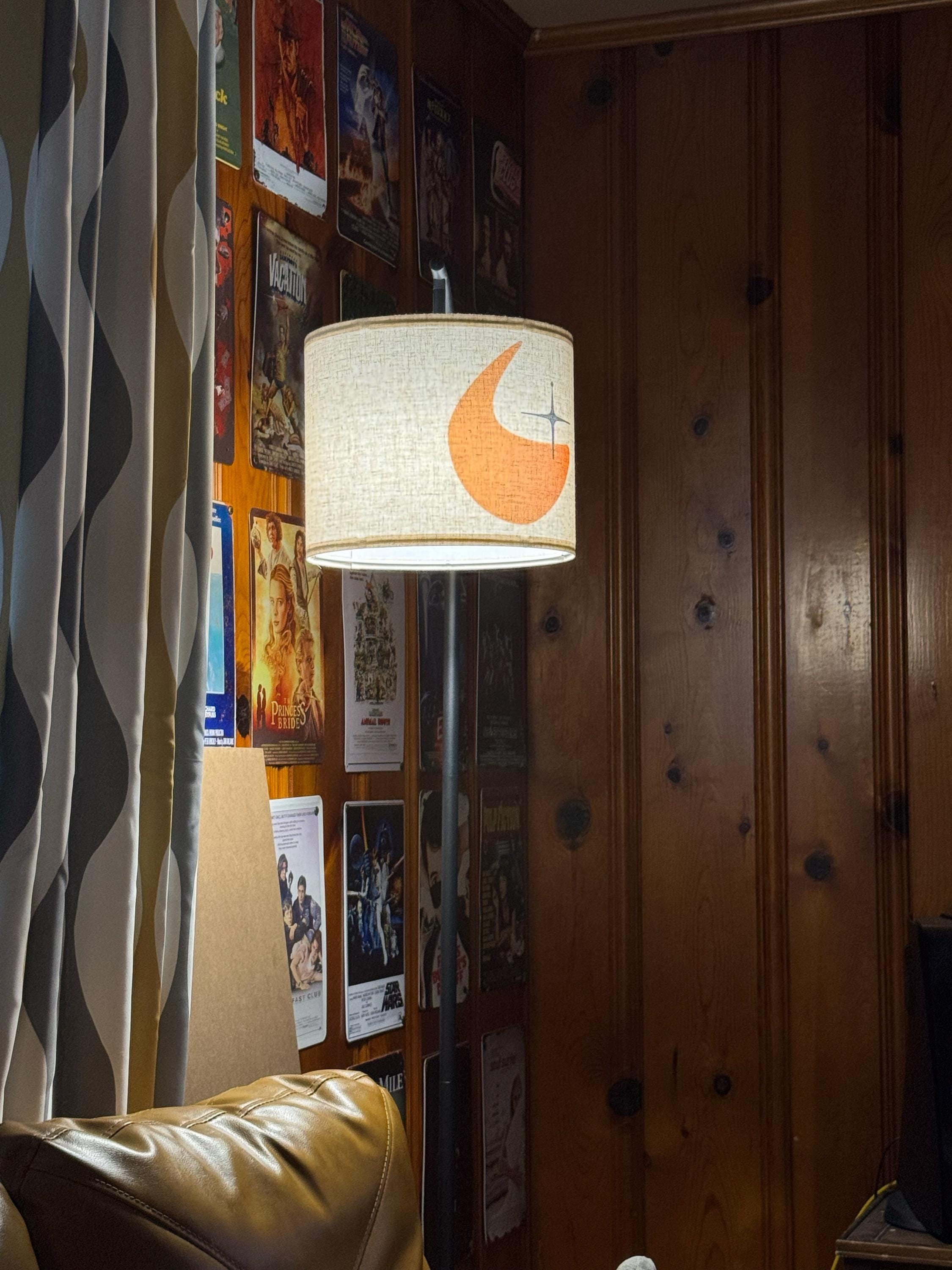 Our MCM Arc FLOOR LAMP features a stylish 1950’s retro orange boomerang and black starburst print. The linen lampshade allows the light to diffuse adding cozy warmth to any room. Perfect for living room, bedroom, entryway or office decor. You can angle the shade to your liking. In addition, it comes with a smart LED Bulb and remote control with lots of mood lighting settings.