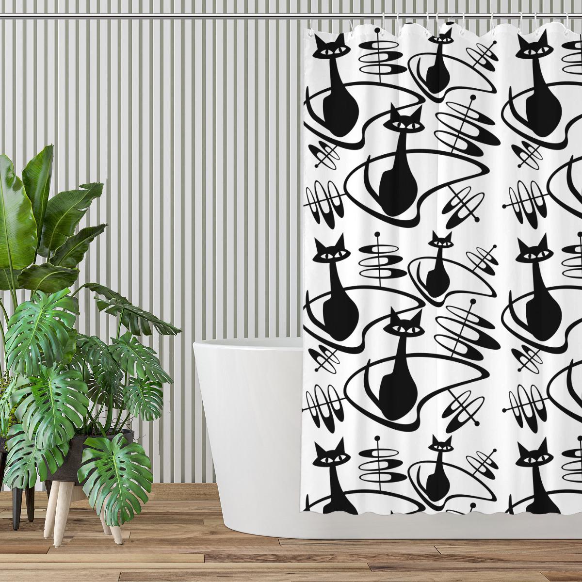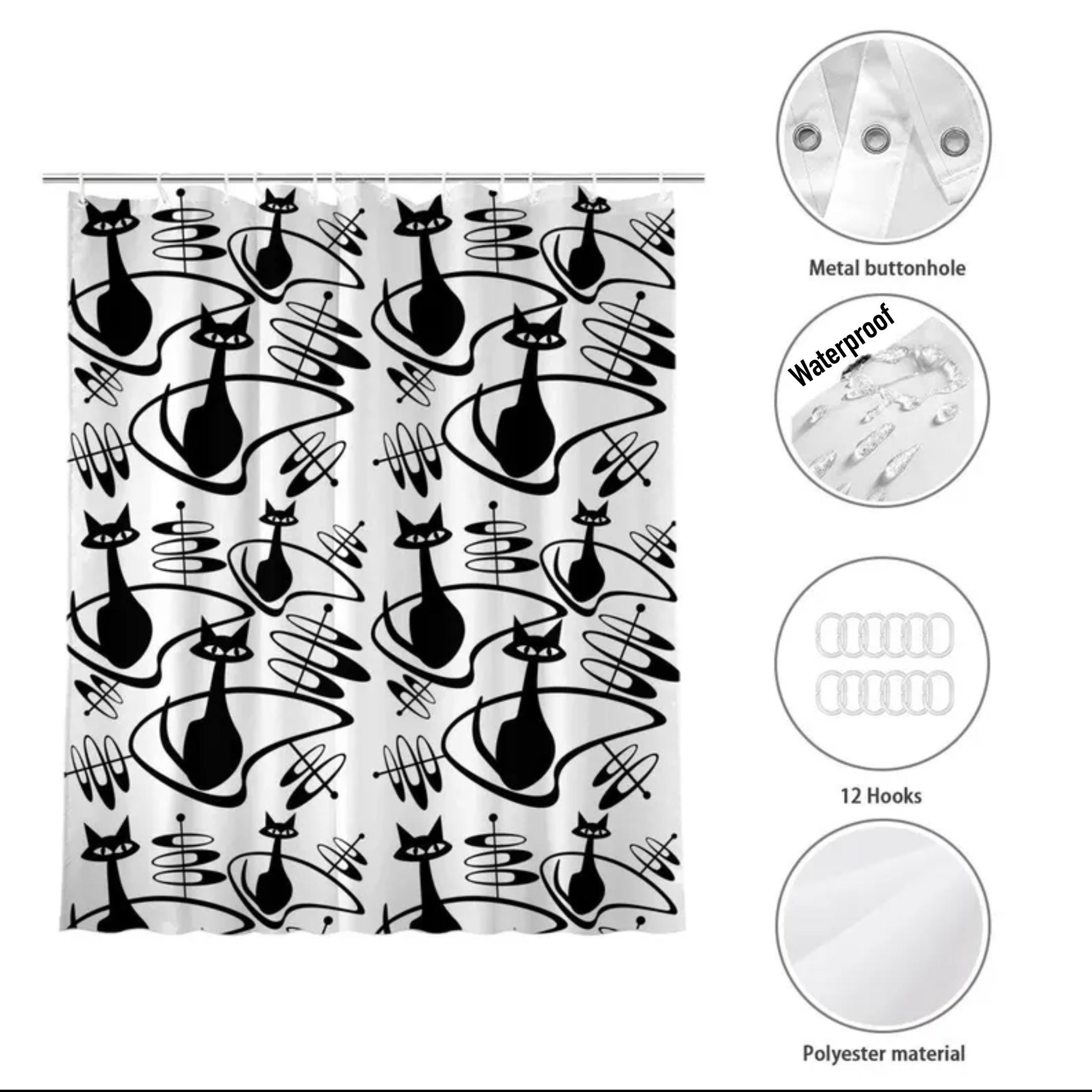Our original, RETRO inspired, atomic age space kitty cosmic print SHOWER CURTAIN will make a great addition to any bathroom decor. Its minimalistic yet whimsical print in black and white can suit many bathroom decor color schemes.