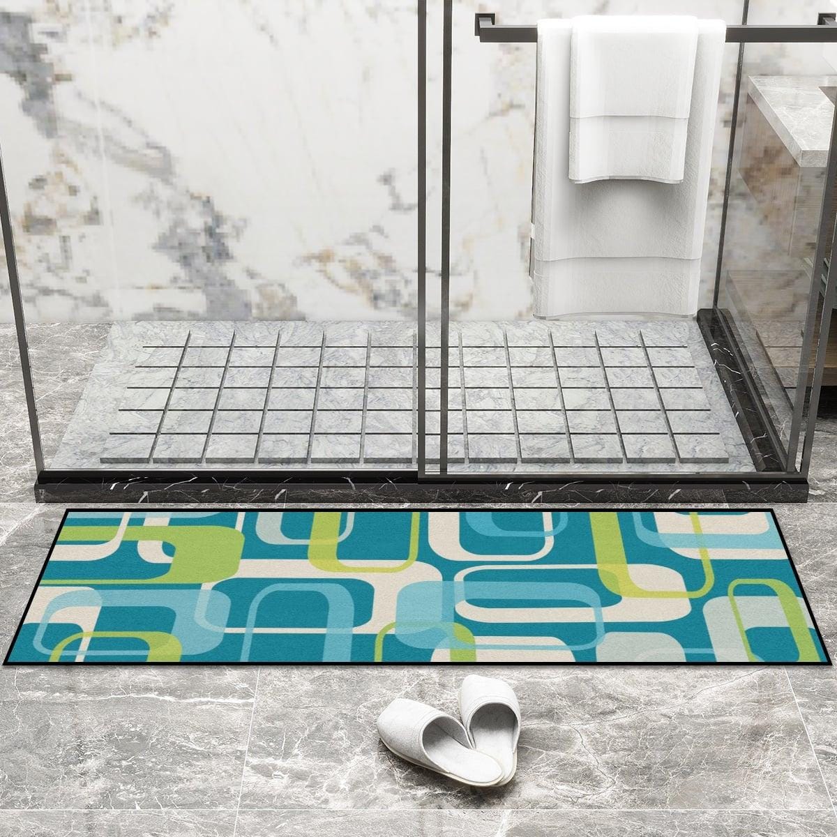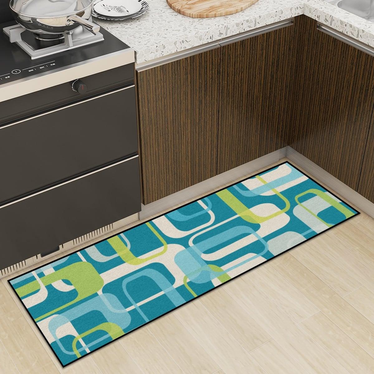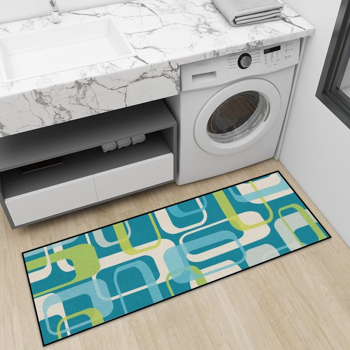 Modern multi-purpose runner rug in a stylish mid-century modern print featuring retro cubes in blue and green. The rug is easy to clean and comes in 2 sizes to suit your decor needs. Perfect for kitchen, entryway, hallway or more.