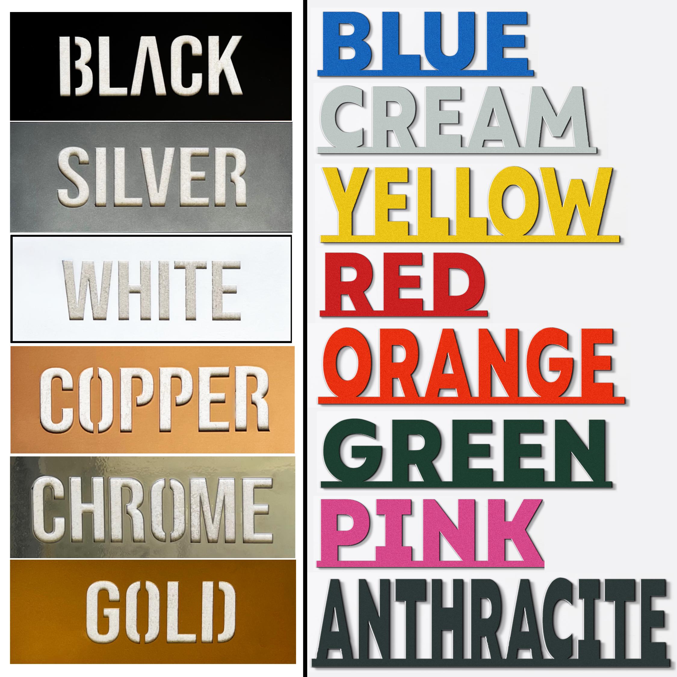 Black, Red, White, Silver, Blue, Gold, Copper, Green, Pink, Anthracite, Cream, Chrome, Yellow and Orange.