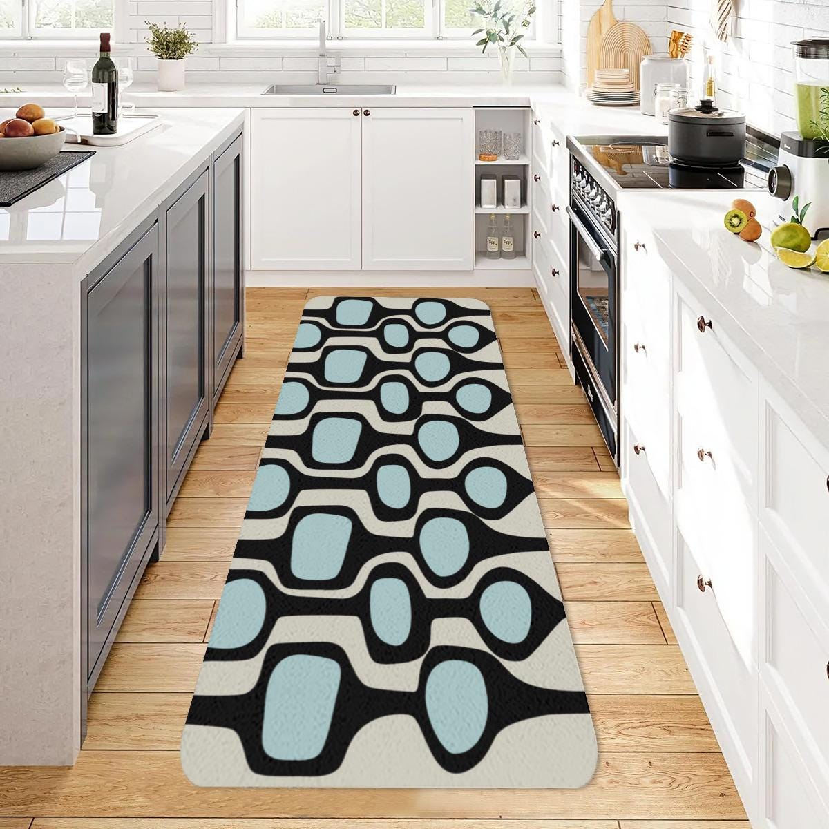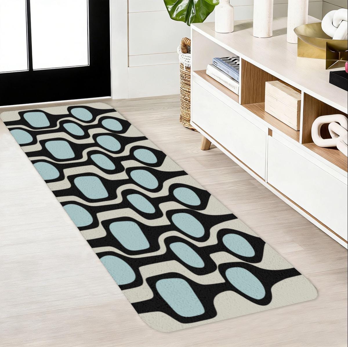 Custom printed mid century modern anti-slip runner rug perfect for your kitchen, bedroom, hallway or entryway. Add some retro style to any room in your home or office, while protecting your floor.